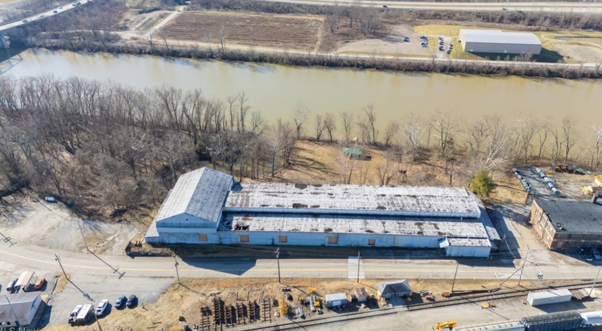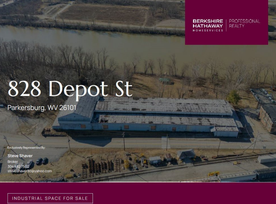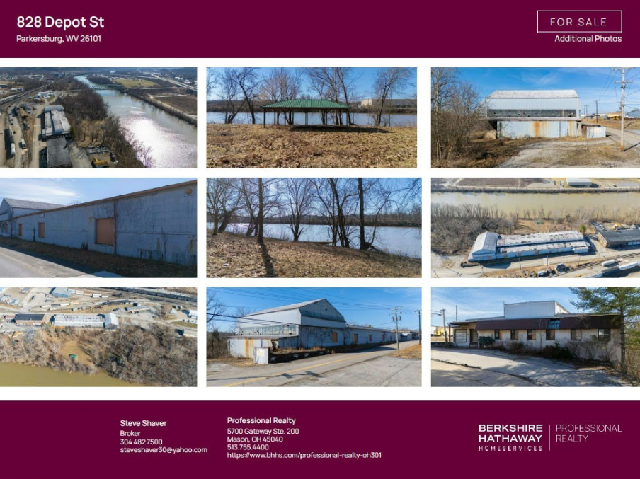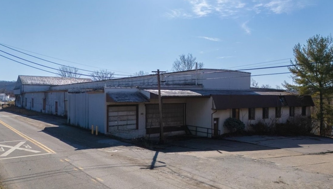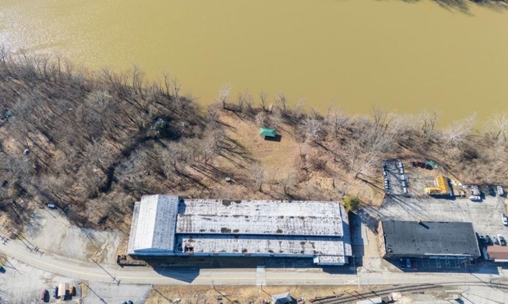 828 Depot Street is a 61,452 square-foot warehouse situated on a 4.54-acre property, spread across three parcels. The property is located on the south side of Depot Street, east of the 625 site. The land has a natural slope, with the warehouse and related structures positioned at a higher elevation on the northern side. The terrain descends toward the south, where the site borders the Little Kanawha River. Thanks to its elevated location, the improvements are outside of the designated flood zone. County records indicate that the structures were originally built in 1903.