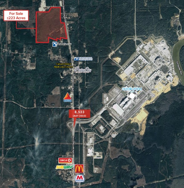 223+/- acres for sale on Hwy 43 just north of Calvert, AL. This property is located across Hwy 43 in very close proximity to the Outokumpu steel mill. The property is in Washington County AL, is unzoned, and just north of the Washington County, Mobile County Line. This property has 1750' of frontage on Hwy 43 with direct access to Hwy 43. The property consists of Washington County AL PIN 21017, 21152, and a portion of 21026. The owner will retain the portion of PIN 21026 that contains the owner's business. The approximate size of the retained portion will be 30+/- acres and will be determined by a future survey.