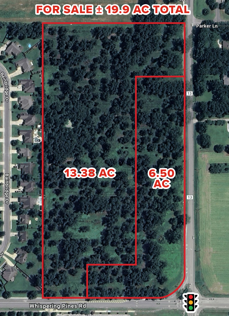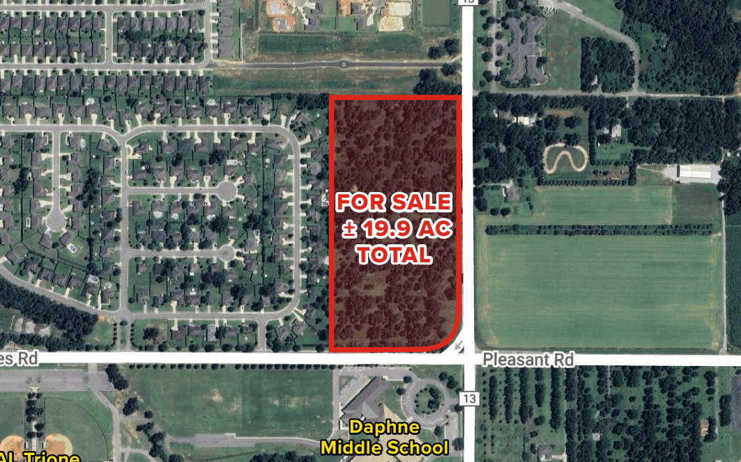 Excellent development opportunity with two illuminated commercial lots for sale on the northwest corner of County Road 13 and Whispering Pines Road in Daphne, Alabama. The property offers more than 1,000 feet of frontage along CR 13 and over 570 feet along Whispering Pines Road. The owner is open to subdividing the parcels based on acceptable terms. Surrounded by a single-family neighborhood to the west, Brennity Assisted Living to the north, and situated across from Daphne Middle School, the site is well-positioned for a variety of uses. Zoning includes B-1 and B-3 classifications.
