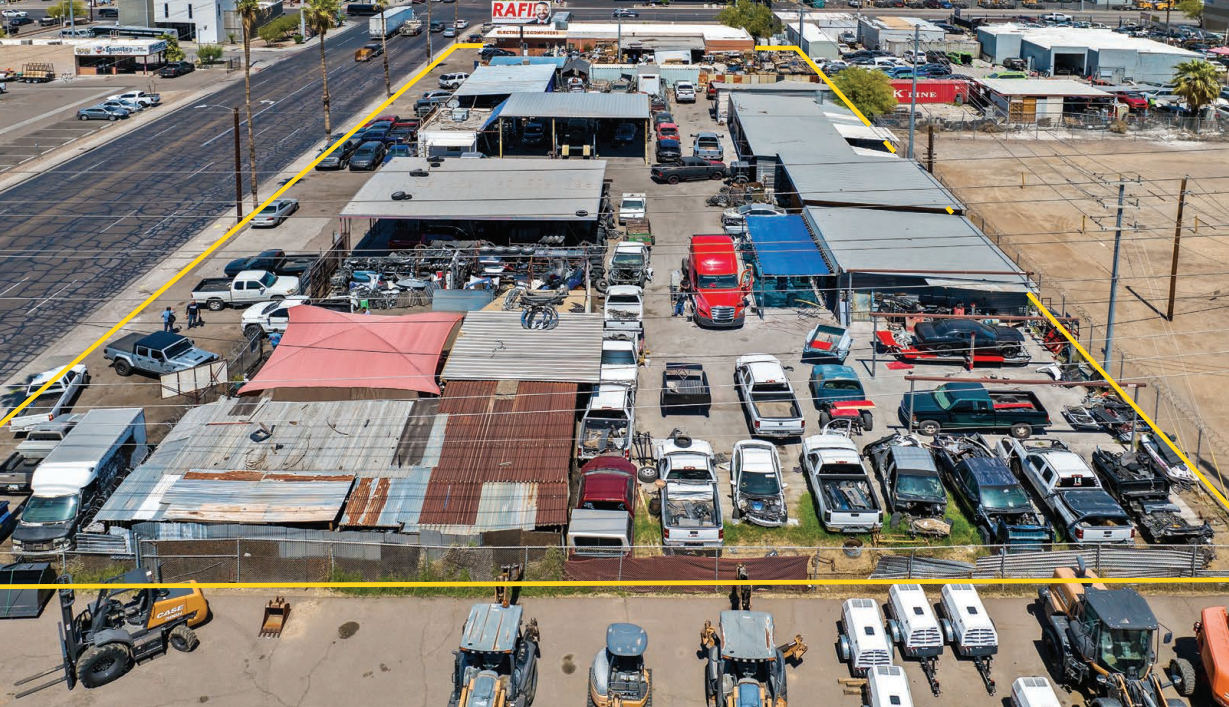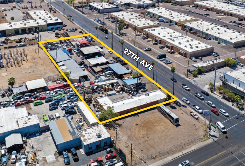 ±1.24-acre industrial/commercial site for sale with direct frontage along 27th Avenue in West Phoenix. The property includes approximately ±15,743 SF of existing structures, consisting of a ±3,500 SF block building and several partially enclosed buildings. Zoned C-3, the mostly asphalt-paved site is well-suited for a contractor yard or outdoor storage. Seller financing is available for qualified buyers—contact the broker for details.