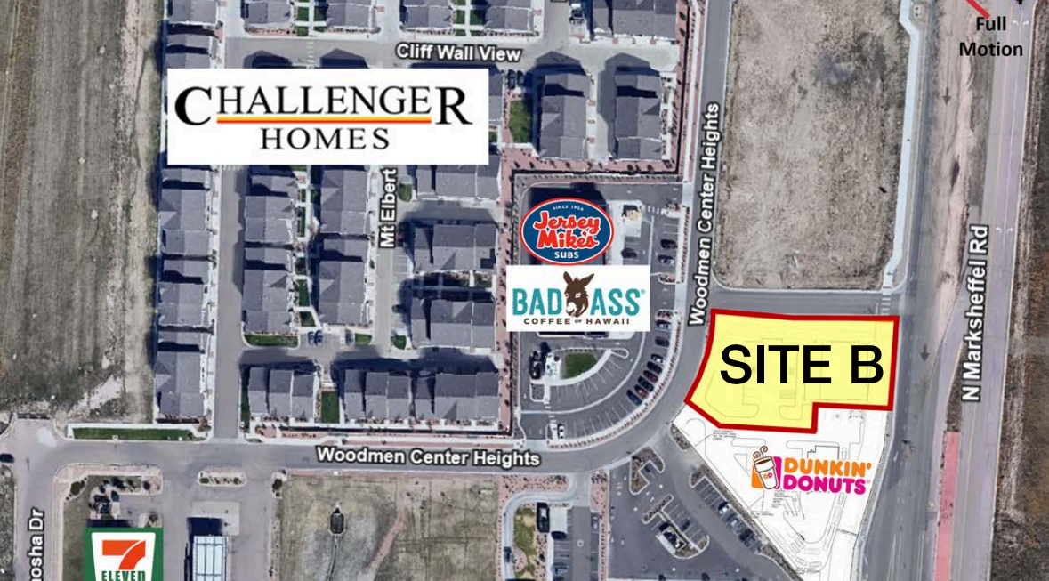 Frontage along E. Woodmen Rd. and Marksheffel Rd. offers excellent access and high visibility from both major arterial roads. The PUD zoning permits a wide range of uses, including drive-thru establishments, automotive services, medical offices, and retail. Nearby tenants include Dunkin, Taco Bell, McDonald’s, and 7-Eleven.