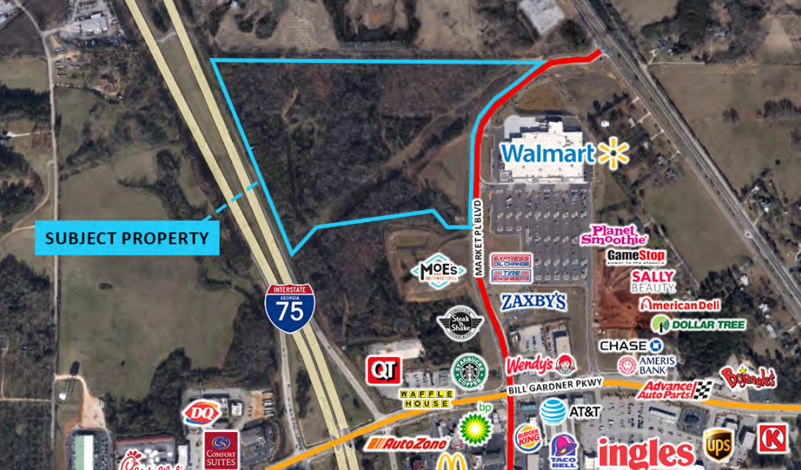 Bull Realty is pleased to present the opportunity to acquire a ±37.95-acre development site located along Interstate 75 and Market Place Boulevard in Locust Grove, Georgia. Currently zoned C-2 (General Commercial), the property allows for a wide range of commercial uses and offers potential for mixed-use rezoning. The estimated usable acreage is approximately 27 acres after accounting for floodplain considerations. Conceptual site plans are included in the offering materials; however, revisions will be required to meet city approvals. While preference will be given to offers without zoning or entitlement contingencies, the seller will consider proposals subject to reasonable approvals. The site features exceptional visibility with more than 1,200 feet of frontage on Interstate 75 and over 1,200 feet of frontage on Market Place Boulevard, directly across from Walmart. Access is convenient, located just two blocks from the Bill Gardner I-75 exit south of Atlanta. The surrounding retail corridor is well established and continues to grow, with major national retailers including Walmart, Ingles, Tanger Outlets, Starbucks, QuikTrip, and a strong presence of hotels and restaurants—making this an ideal location for commercial or mixed-use development.