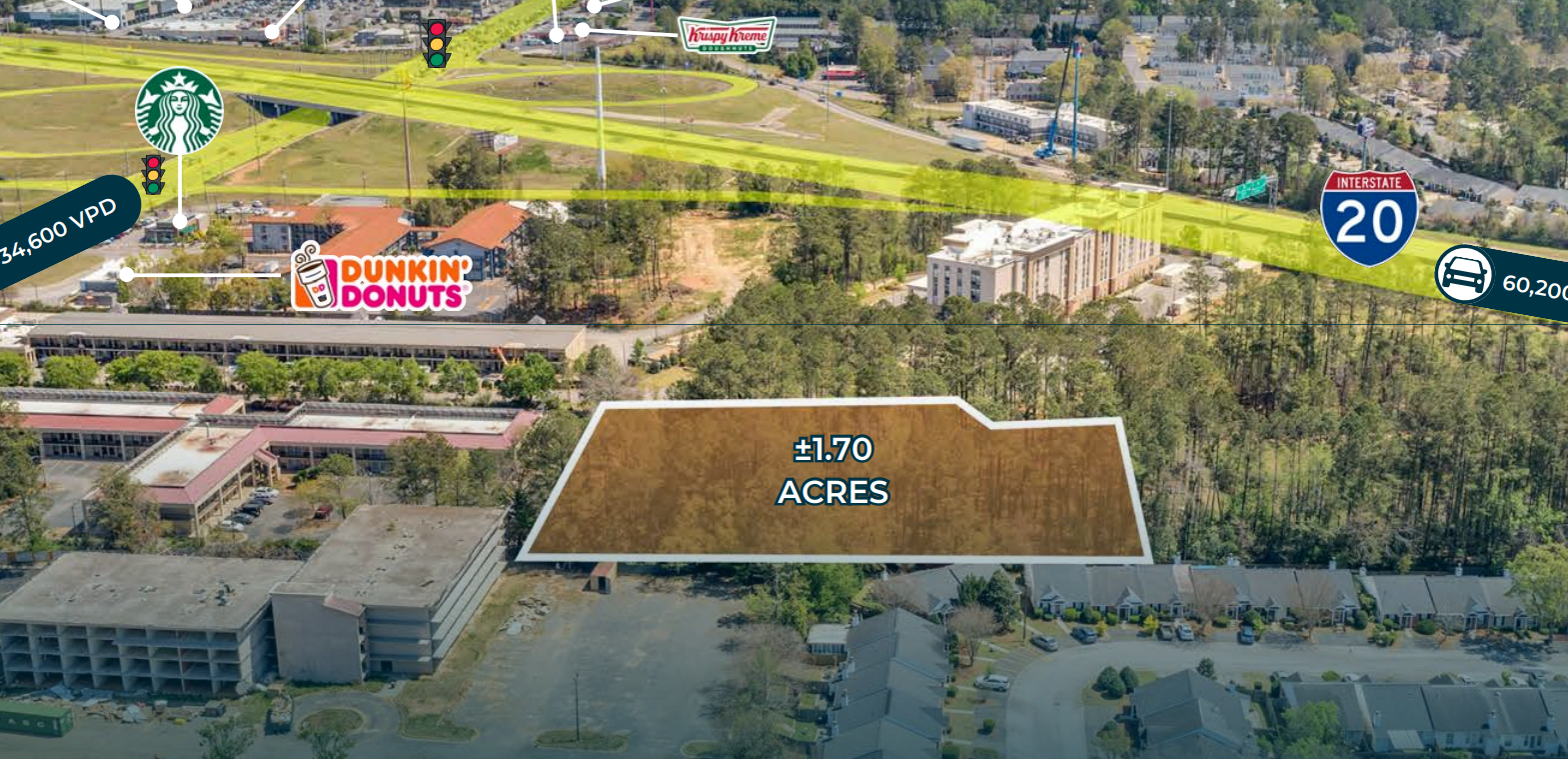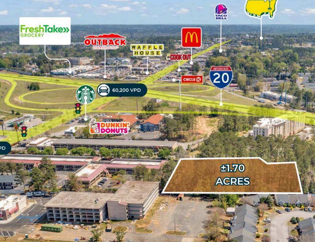The Finem Group at Meybohm Commercial exclusively presents a ±1.70-acre commercial redevelopment site at 3030 A Washington Road in Augusta, Georgia, just seconds from I-20 and 1.5 miles from the Augusta National Golf Club. Situated along one of the city’s busiest corridors, the property benefits from high visibility and strong traffic counts of 34,600 VPD on Washington Road and 60,200 VPD on I-20. Zoned B-2, one of Columbia County’s most flexible commercial classifications, the site supports a wide range of uses including hospitality, self-storage, restaurants, or general retail. Featuring flat topography and no environmental encumbrances, the parcel is primed for immediate development. Surrounded by national retailers such as Starbucks, Dunkin’, 7 Brew, and Hampton Inn, and adjacent to a growing residential base, the property benefits from strong commercial synergy. While partially situated behind an existing hotel, its proximity to major tenants and I-20 ensures high destination potential. With full-motion access, excellent connectivity, and a regional market exceeding 624,000 people, this site offers an exceptional opportunity for businesses seeking a high-traffic, strategically located development in Augusta’s thriving commercial corridor.