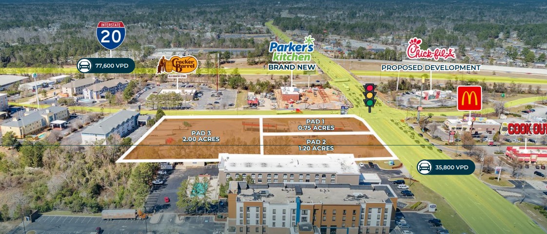 • Pad 1: ±0.75-acre corner parcel with full-motion access off Park West Drive. Ideal for a drive-thru coffee user, oil change, or smaller format QSR or Bank. • Pad 2: ±1.20-acre front-row parcel along Jimmie Dyes Parkway with full-motion access off Park West Drive. Highly visible and suitable for a quick-service restaurant. • Pad 3: ±2.00-acre interior parcel with shared access and excellent exposure from I-20. Ideal for a large sit-down restaurant.