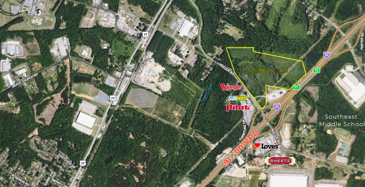 •±75.86-acre commercial development site located along the I-85 corridor within the Charlotte MSA •Exceptional visibility and direct access to the primary north–south interstate, with approximately 91,500 VPD •Strategically positioned to serve major regional markets •Located in one of the East Coast’s fastest-growing metro areas, approximately 35 minutes from Uptown Charlotte •Public water and sewer available