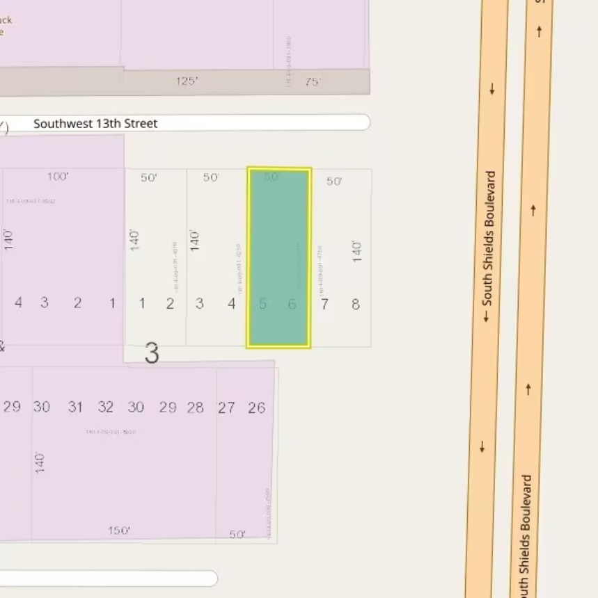 Lots #5 & #6 of Block #3, Pryors Elm Grove Addition. Originally 50' x 140' but with an additional 30' added after the completed vacating of 13th Street. Now 50' x 170' (8,500')(.1951 Acre)