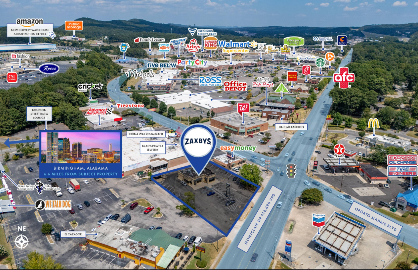 Northmarq National Restaurant Group is proud to present the sale of a prime single-tenant Zaxby’s property located in Birmingham, Alabama. This investment offers a fee simple, Absolute NNN lease with 17 years remaining on a 20-year term, plus four additional 5-year renewal options. The lease includes rare 2% annual rent increases during both the initial term and option periods, offering reliable passive income and a consistent hedge against inflation. The property benefits from strong surrounding retail synergy, neighboring major national retailers such as Walmart, The Home Depot, Publix, and Eastwood Plaza Shopping Center. It is situated less than one mile from a newly constructed Amazon distribution and delivery facility. Strategically located, the site is within a 10-minute drive to Birmingham-Shuttlesworth International Airport and just 15 minutes from downtown Birmingham. Additionally, the Zaxby’s is positioned under 5 miles from two major Birmingham developments—Edgehill at Southtown, a mixed-use commercial hub, and Maiden Heights, a high-end master-planned residential community.