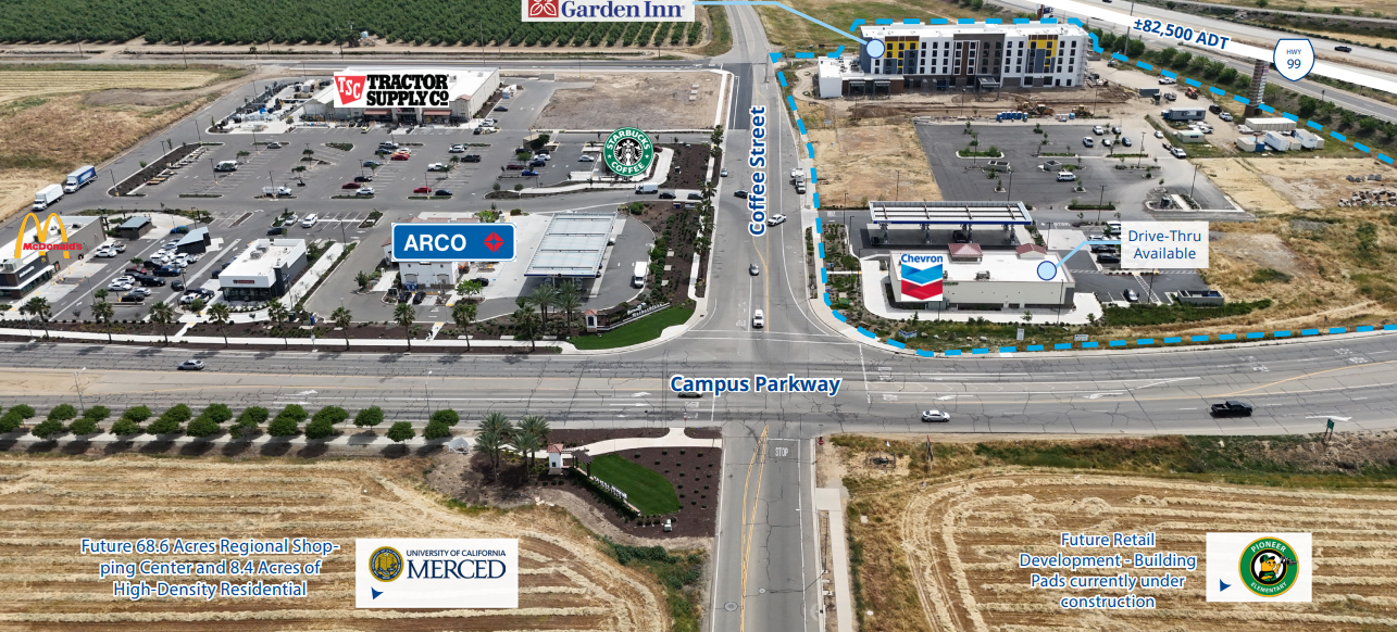 •Pads available for ground lease or custom build-to-suit. •Anchored by Hilton Garden Inn, Chevron, and The Chicken Shack. •Prime visibility from Highway 99, adjacent to off-ramp. •Freeway monument signage available. •Situated at the Highway 99 and Campus Parkway interchange in Merced, California.