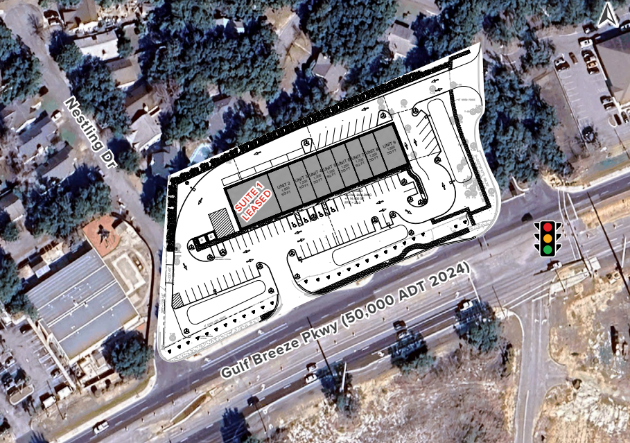 This new retail development is prominently situated at the fully signalized hard corner of U.S. Highway 98 and Gulf Breeze Parkway. Offering units for lease from approximately 1,200 to 1,800 SF, the property delivers exceptional visibility, with over 50,000 vehicles passing daily. Located in one of Northwest Florida’s most affluent trade areas, with a median household income exceeding $130,000, the site benefits from both year-round local and tourist traffic en route to the beach. Nearby co-tenants include Walmart (Supercenter & Neighborhood Market), Publix, Starbucks, Chick-fil-A, and other national retailers.
