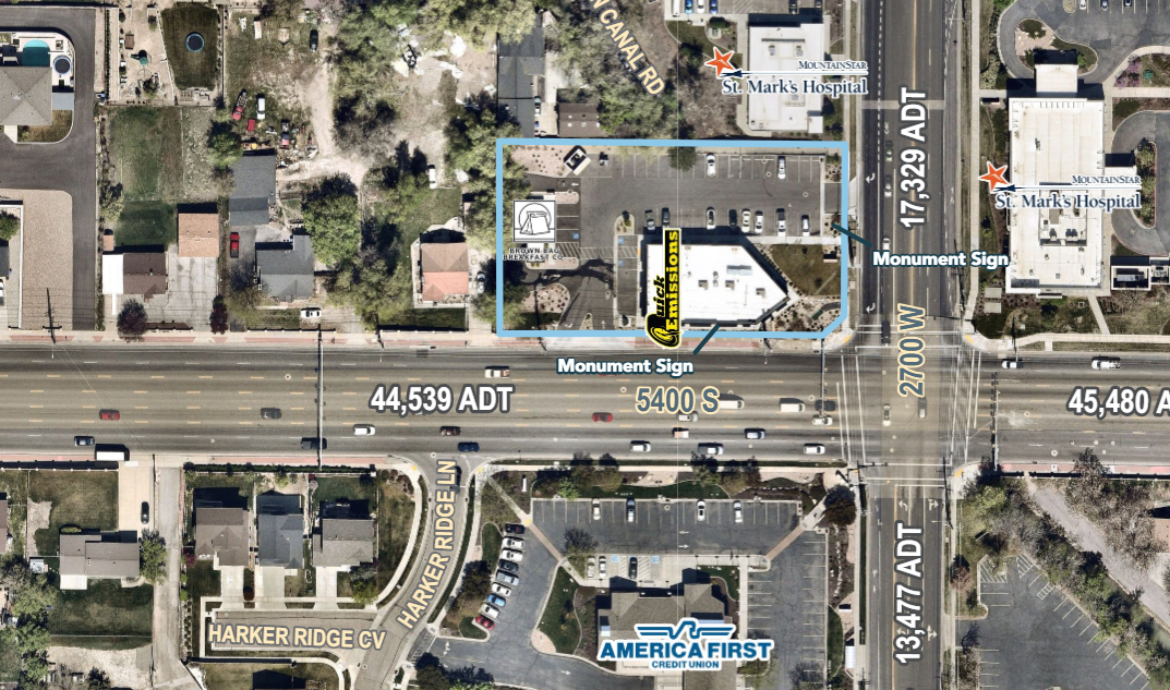 The space is offered at an asking rate of $30.00 per square foot, with estimated NNN expenses of $5.00 per square foot. A total of 3,637 square feet is available in a desirable end-cap location and includes an existing hood and grease trap. Prospective tenants are asked not to disturb the current tenant. The property benefits from strong traffic exposure, with approximately 45,480 average daily trips along 5400 South and 17,329 average daily trips along 2700 West.