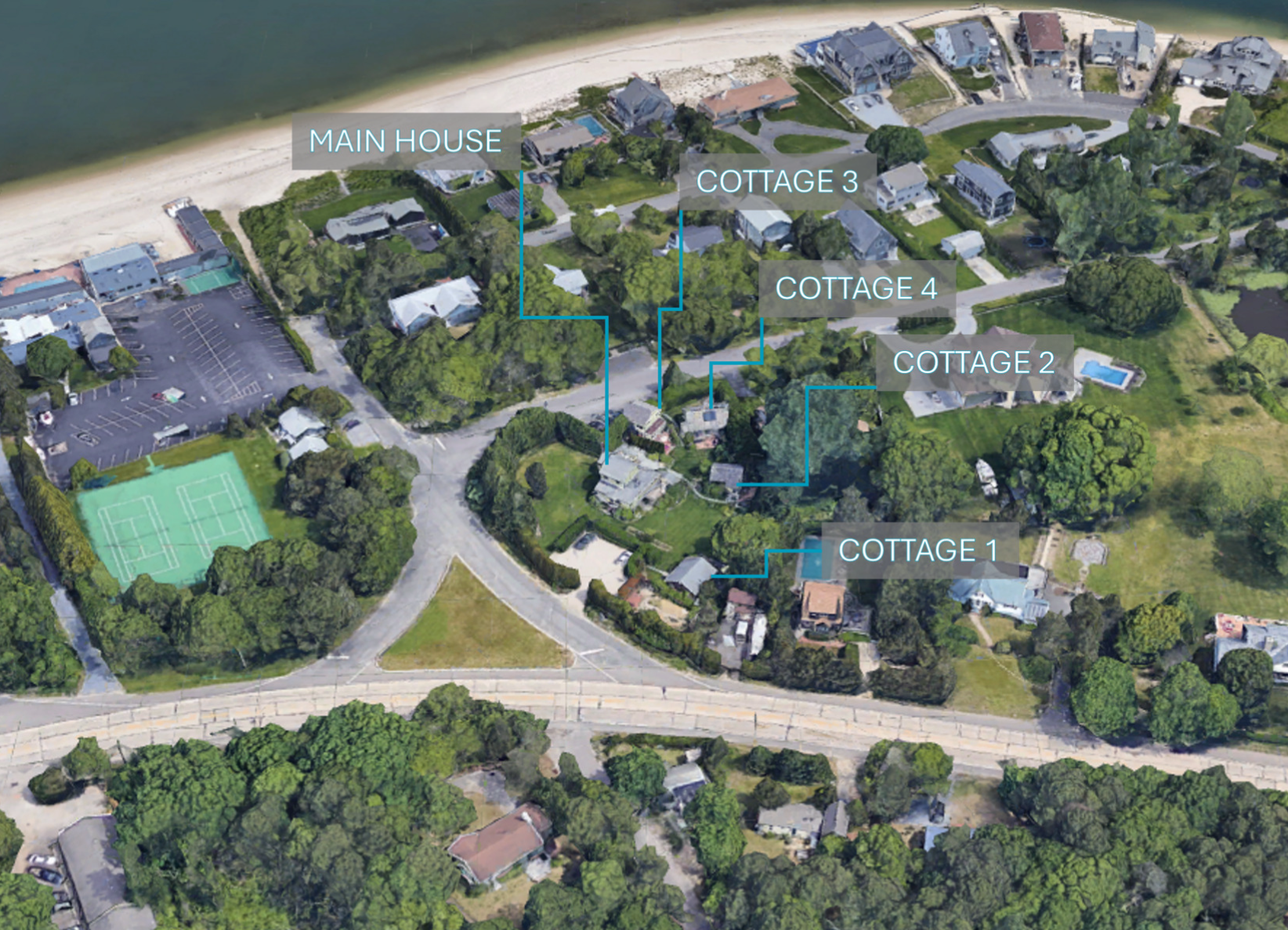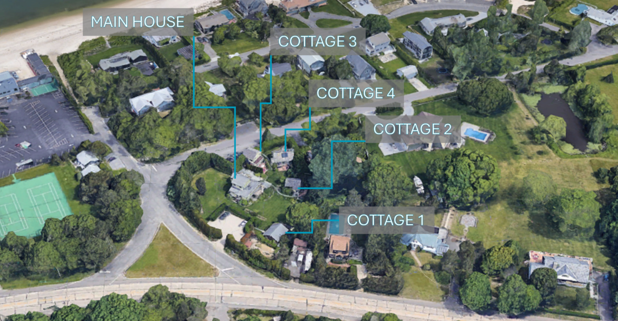 Presenting a rare opportunity to acquire a private compound enclave just 100 yards from beach access to Peconic Bay. Located at 127 Inlet Road West at the gateway to Southampton, this exceptional offering consists of five free-standing, year-round residences set on a beautifully landscaped 0.80-acre parcel. The compound is anchored by a four-bedroom, three-bath main home and complemented by four additional cottages: two two-bedroom/one-bath residences and two one-bedroom/one-bath residences. Each unit has been renovated, is well-appointed, separately metered, and features its own private outdoor space. Shared amenities include an outdoor shower, multiple garden lounge areas, a thriving vegetable and fruit garden, storage sheds for bikes and kayaks, shared laundry facilities, and three expansive parking areas. The property benefits from a strong rental history, with several units offered fully furnished. Notably, historical rental income exceeded current levels, highlighting significant value-add potential through repositioning, enhanced management, or strategic marketing. With its prime proximity to the bay, flexible unit configuration, and established income track record, the compound is ideally suited for use as a boutique bed and breakfast, year-round rental investment, wellness retreat, or private family estate. Situated in the Hamlet of Shinnecock Hills within the Tuckahoe School District, this offering combines location, versatility, and upside in one of the Hamptons’ most desirable settings.