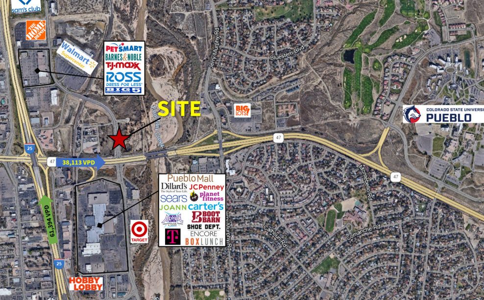 Asking Price: $25.00 – $27.00 PSF . This property is ideally located just east of the I-25 and Highway 50/Highway 47 interchange, west of CSU Pueblo, and approximately 30 minutes from Colorado Springs Airport. Situated in Pueblo’s most dynamic retail corridor, the site lies just north of Pueblo Mall and south of major retailers including Sam’s Club, Home Depot, and Walmart, offering excellent visibility and access to high-traffic shopping areas.