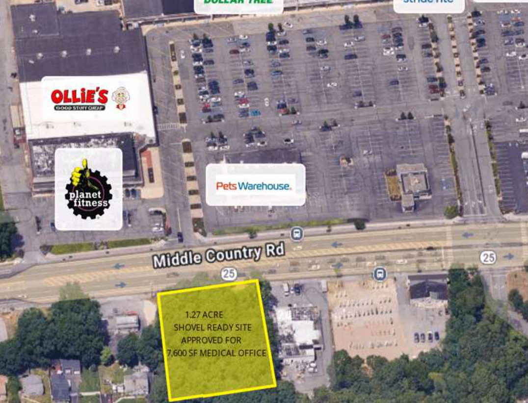 An exceptional 1.27-acre shovel-ready development site is available in a prime Selden location, fully approved for the construction of a 7,600-square-foot medical building. Positioned along heavily traveled Middle Country Road and directly across from the highly active Selden Plaza Shopping Center, the property offers outstanding visibility, strong traffic counts, and more than 150 feet of frontage. The site is ideally suited for medical office use, further enhanced by brand-new luxury apartment developments nearby, creating a built-in patient base. Located just steps from County Road 83 with convenient access to the Long Island Expressway, Sunrise Highway, and other major roadways, this property delivers excellent regional connectivity. Offered as part of a seven-property portfolio, it presents a compelling opportunity for developers or medical users seeking a strategic, high-exposure location.
