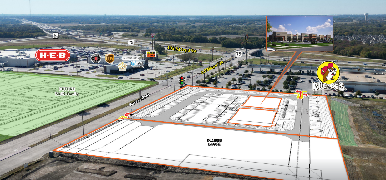 • Strip delivering in March 2027. • Conveniently located next to US- Hwy 75 providing easy access. • Strategically located adjacent to Buc-ee’s and across the street from HEB. • Buc-ee’s brings in over 1 million visits per month.
